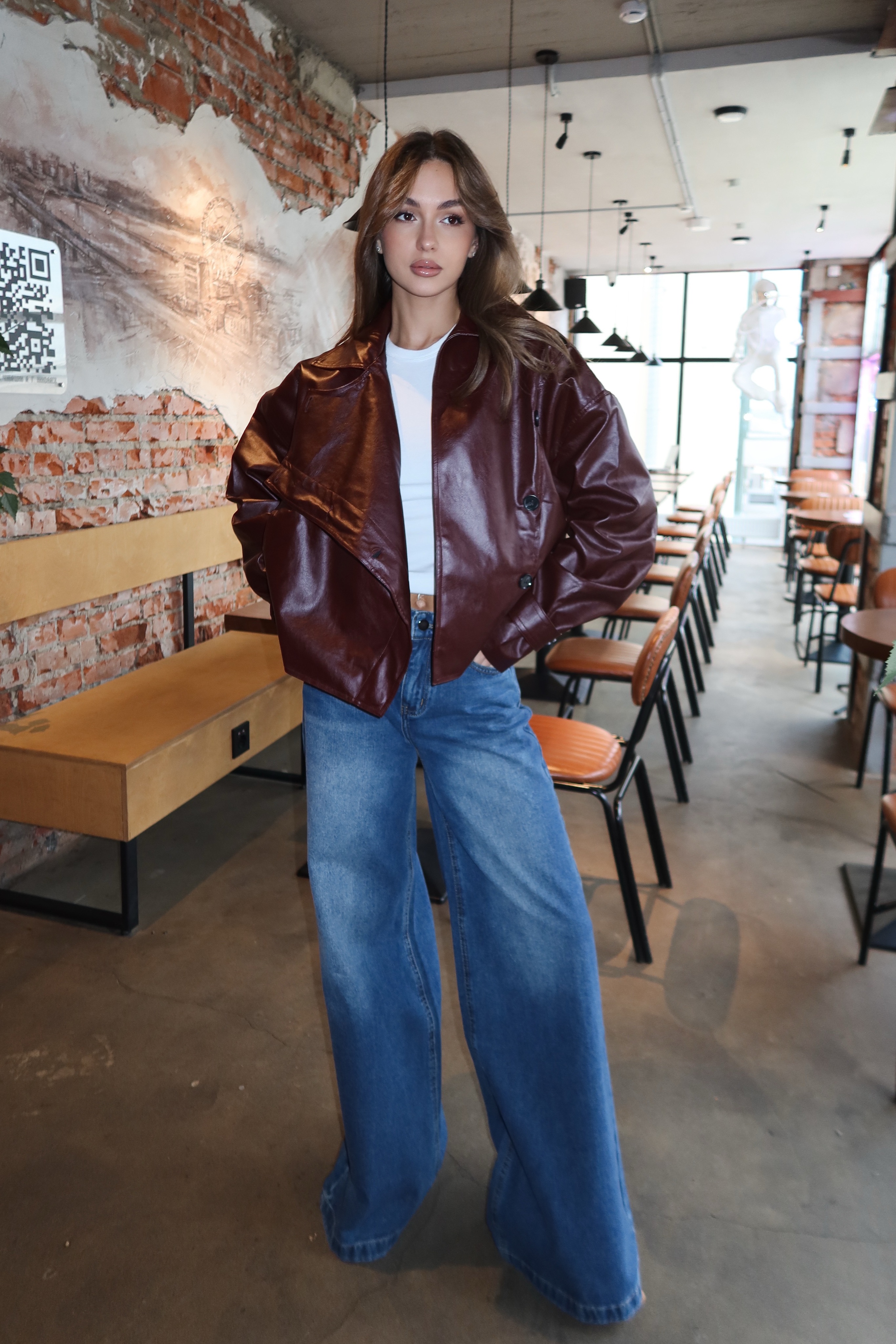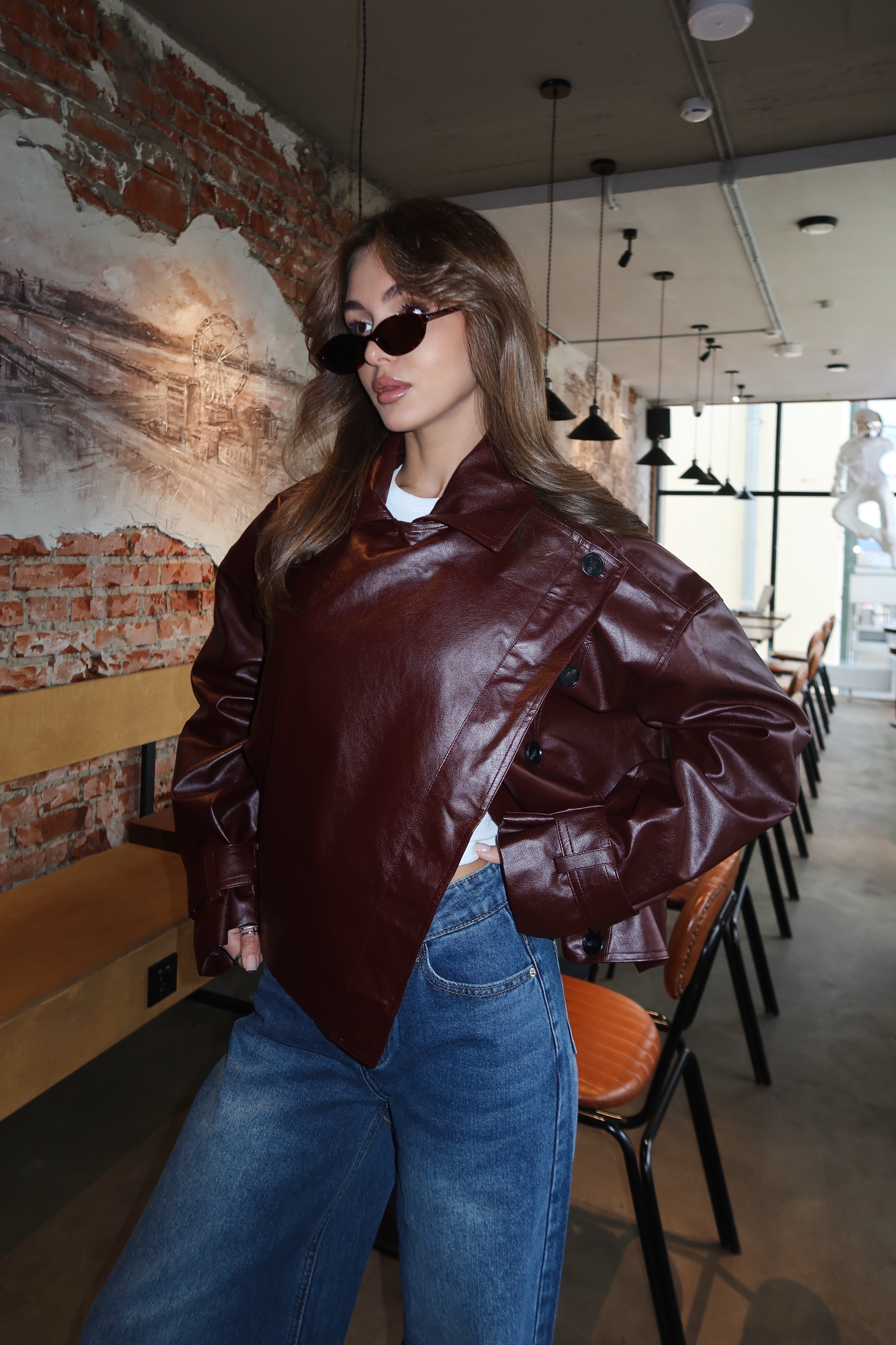Бомбер из эко кожи, ассиметричный, на пуговицах
