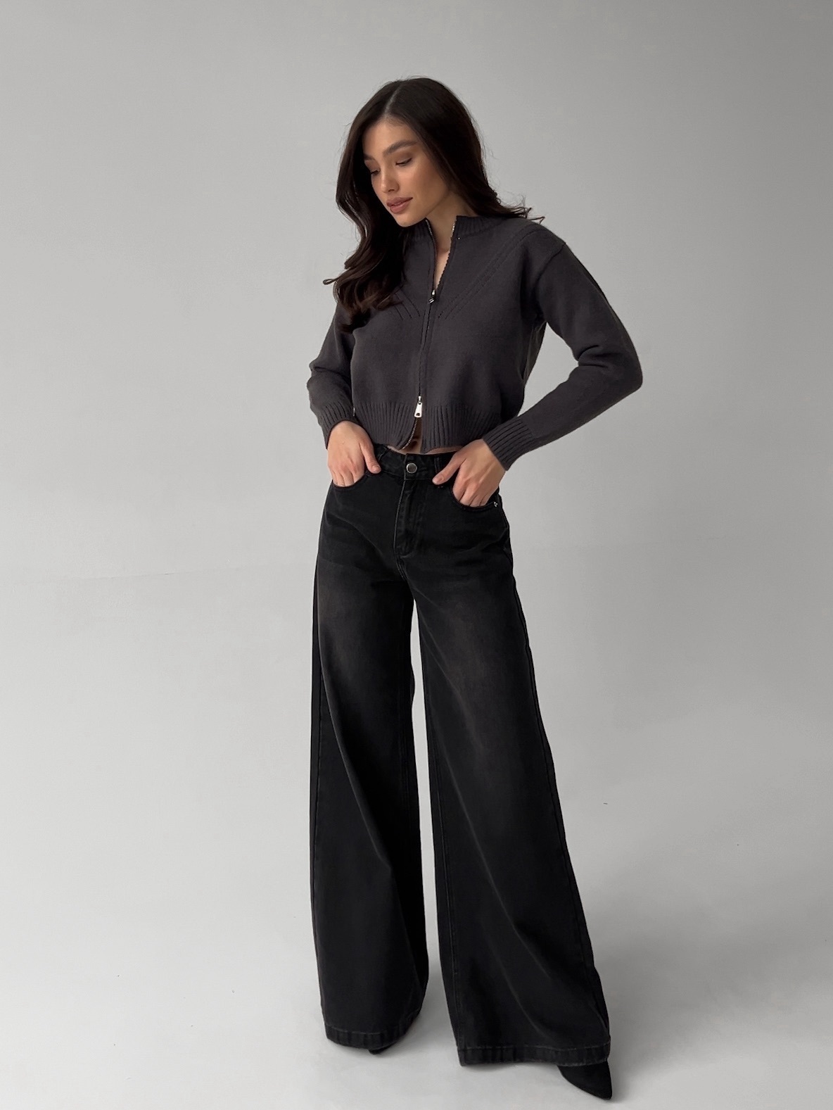 Модель в черных и голубых джинсах: