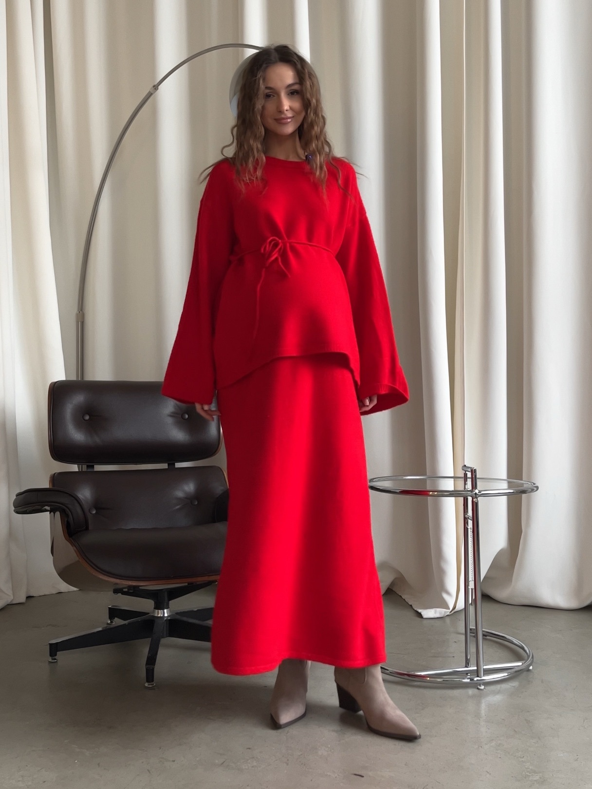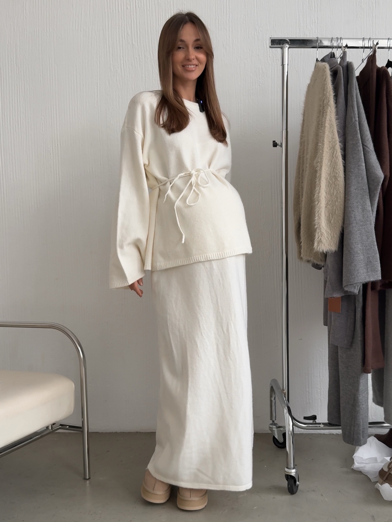 Комплект вязаный, свитер с завязкой и юбка
