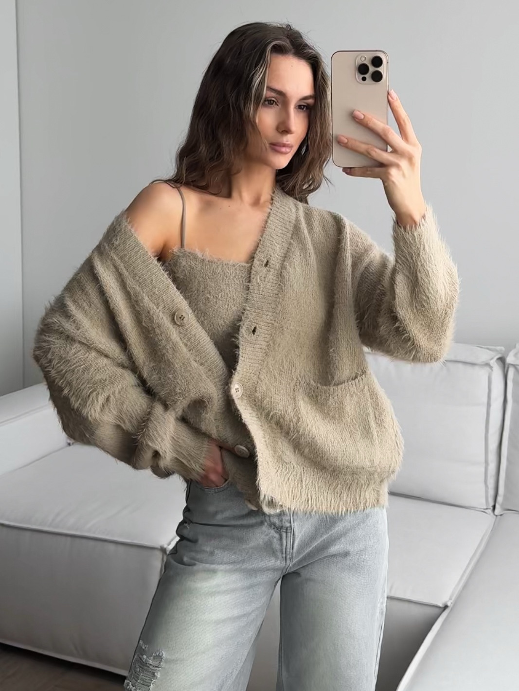Комплект двойка вязаный, пушистый, топ и короткий кардиган
