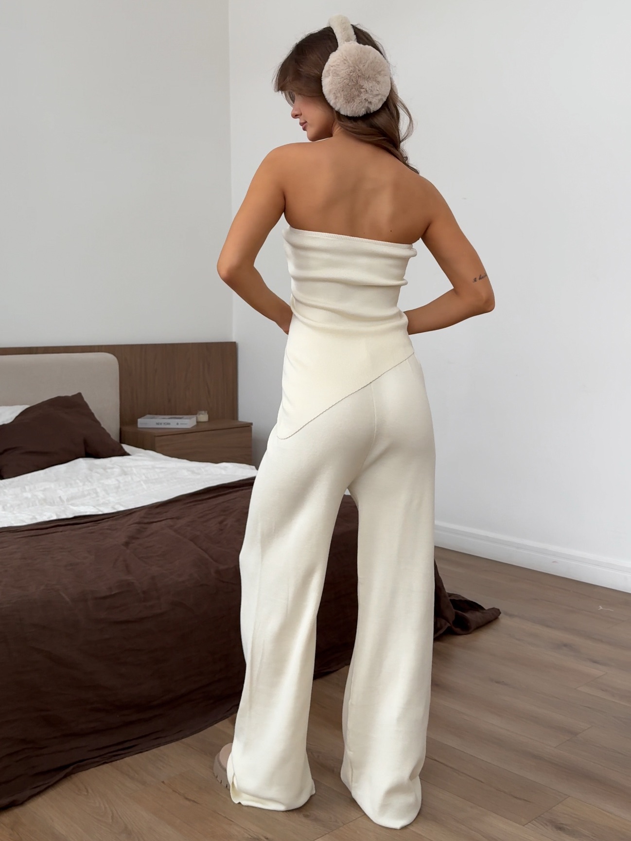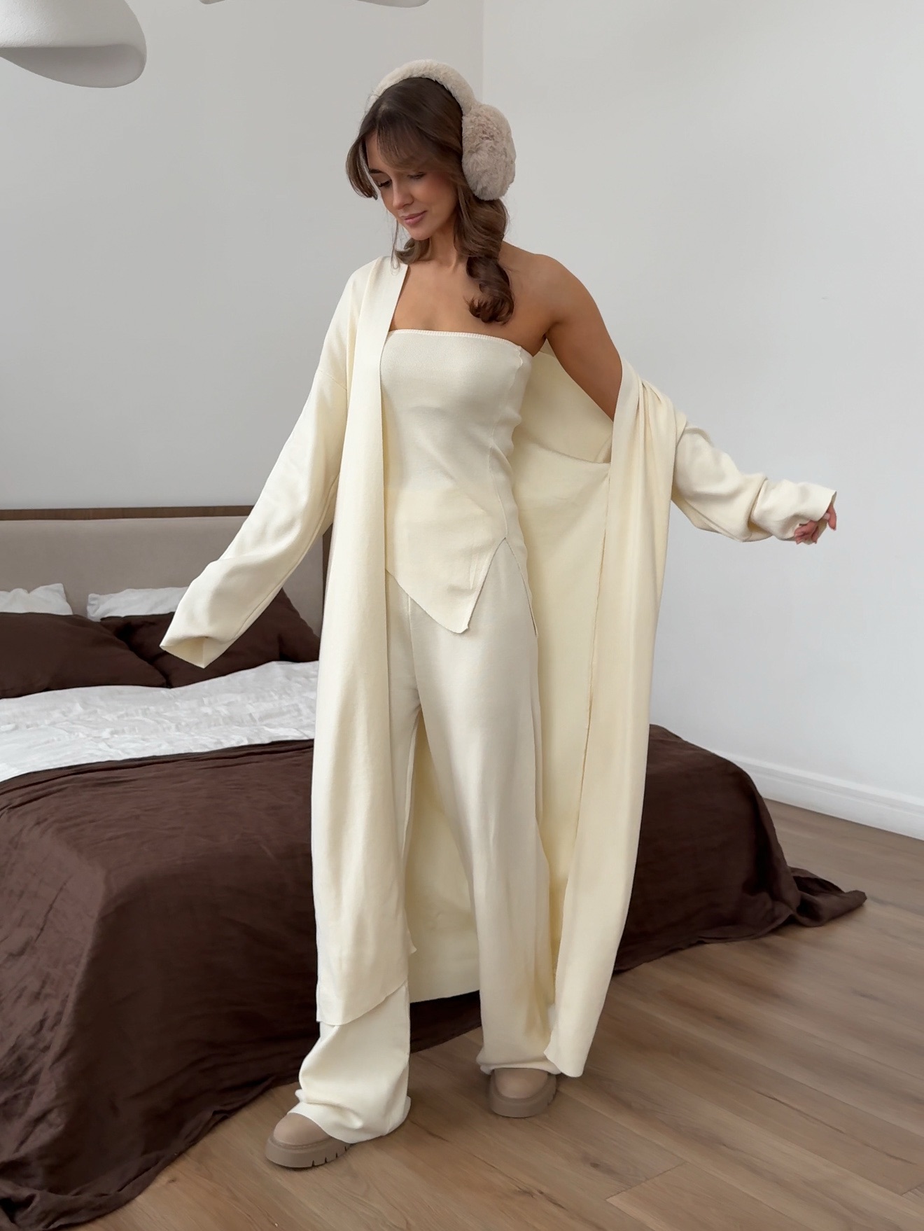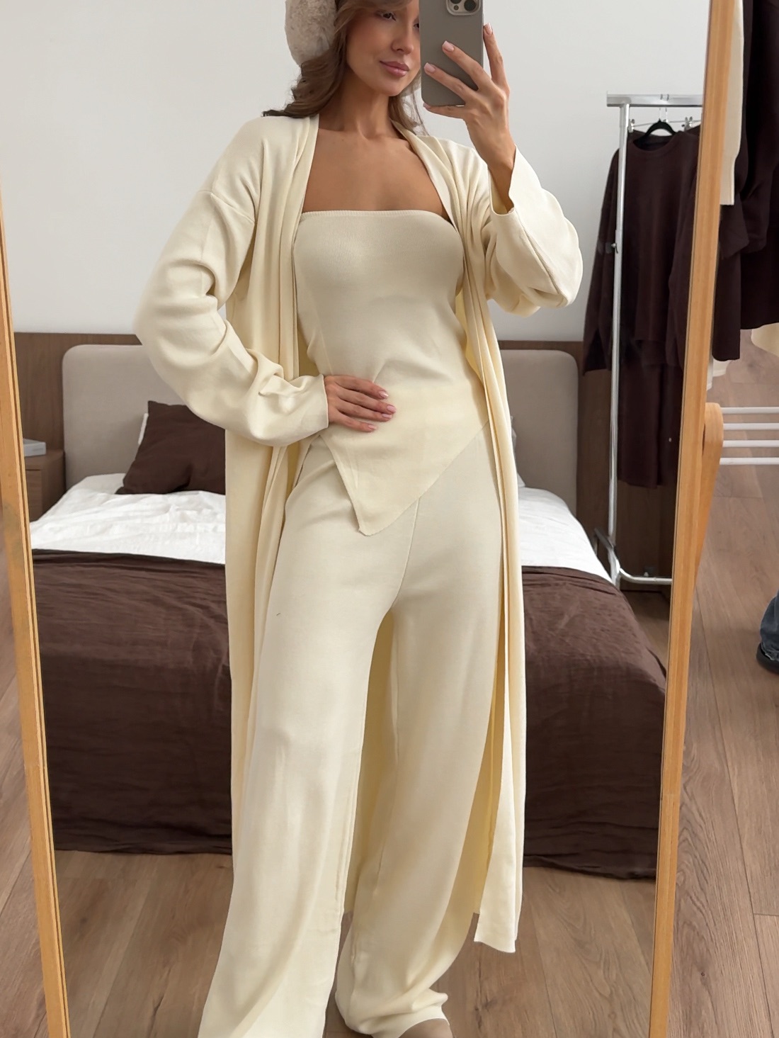 Комплект тройка вязаный, топ косого кроя, брюки и кардиган
