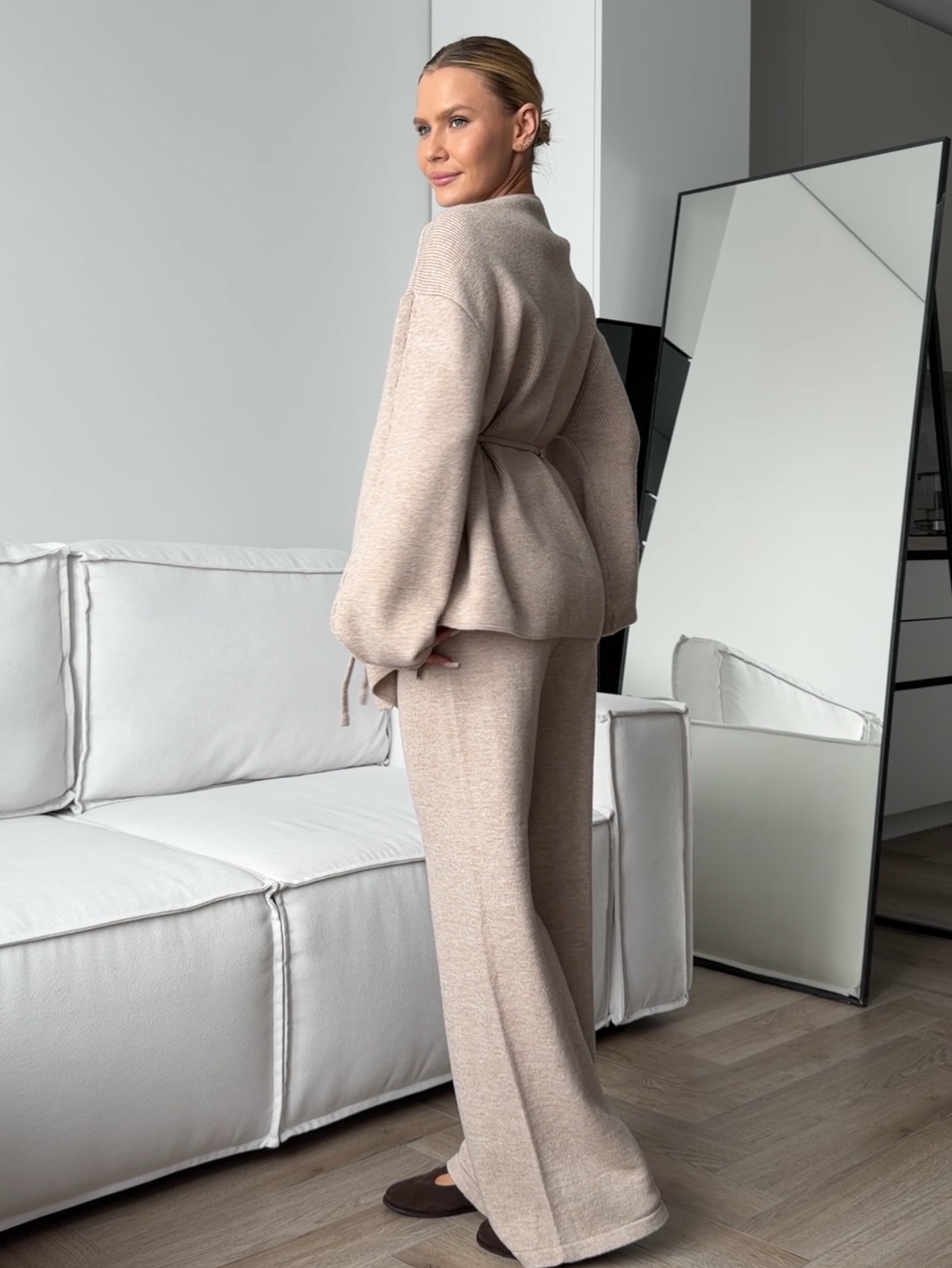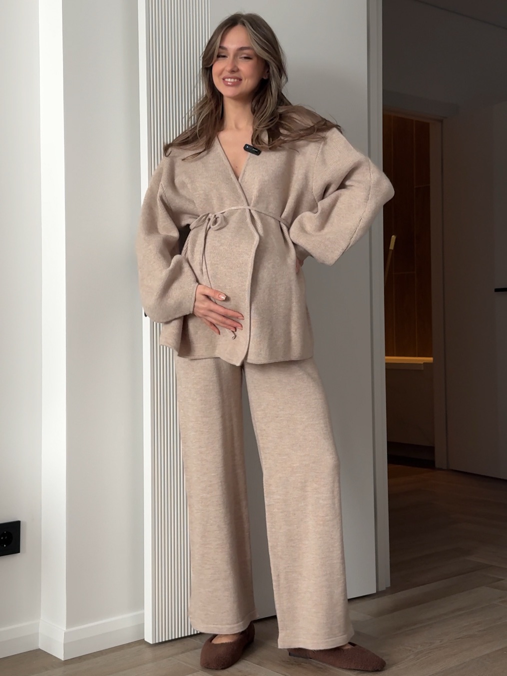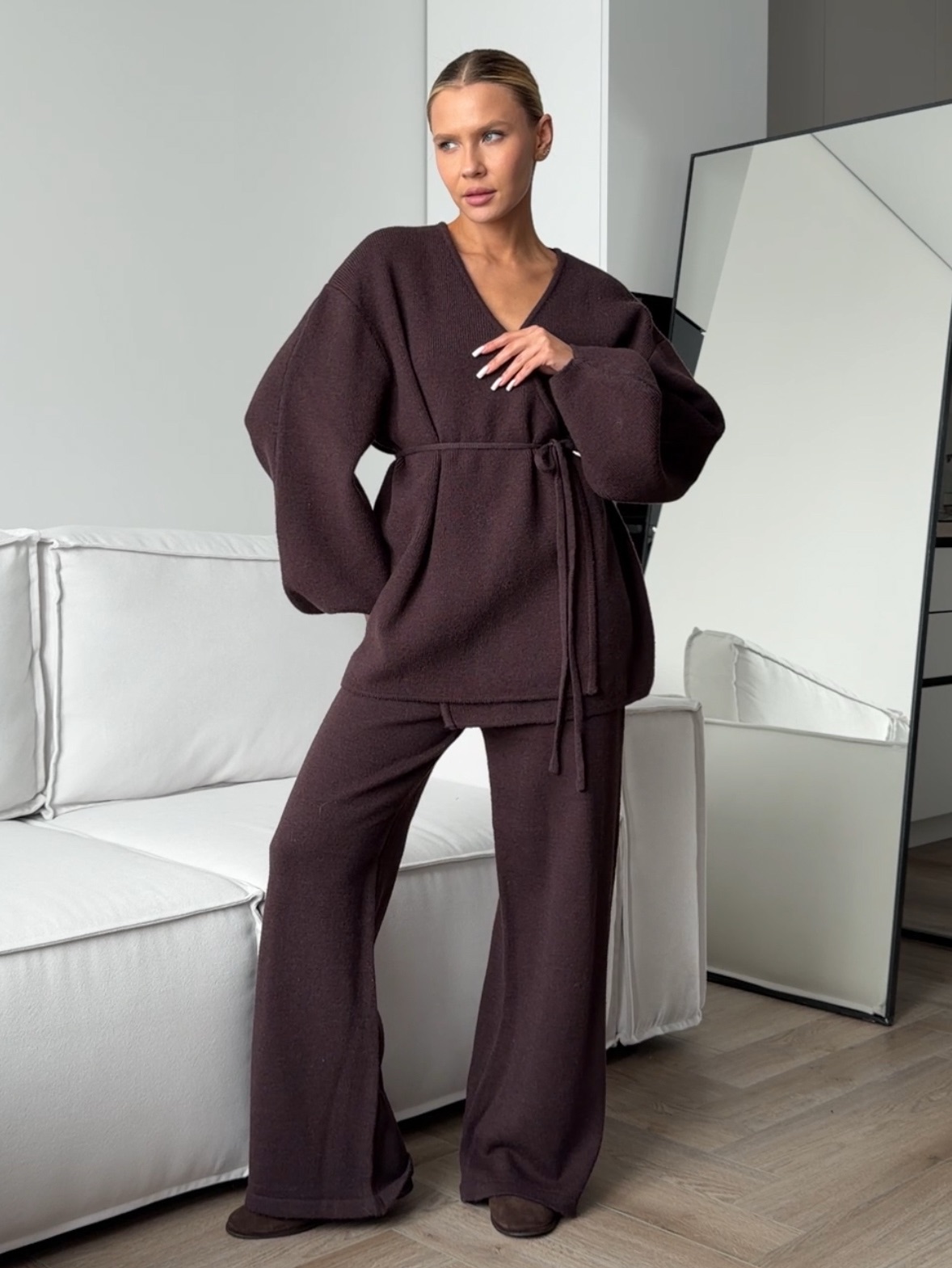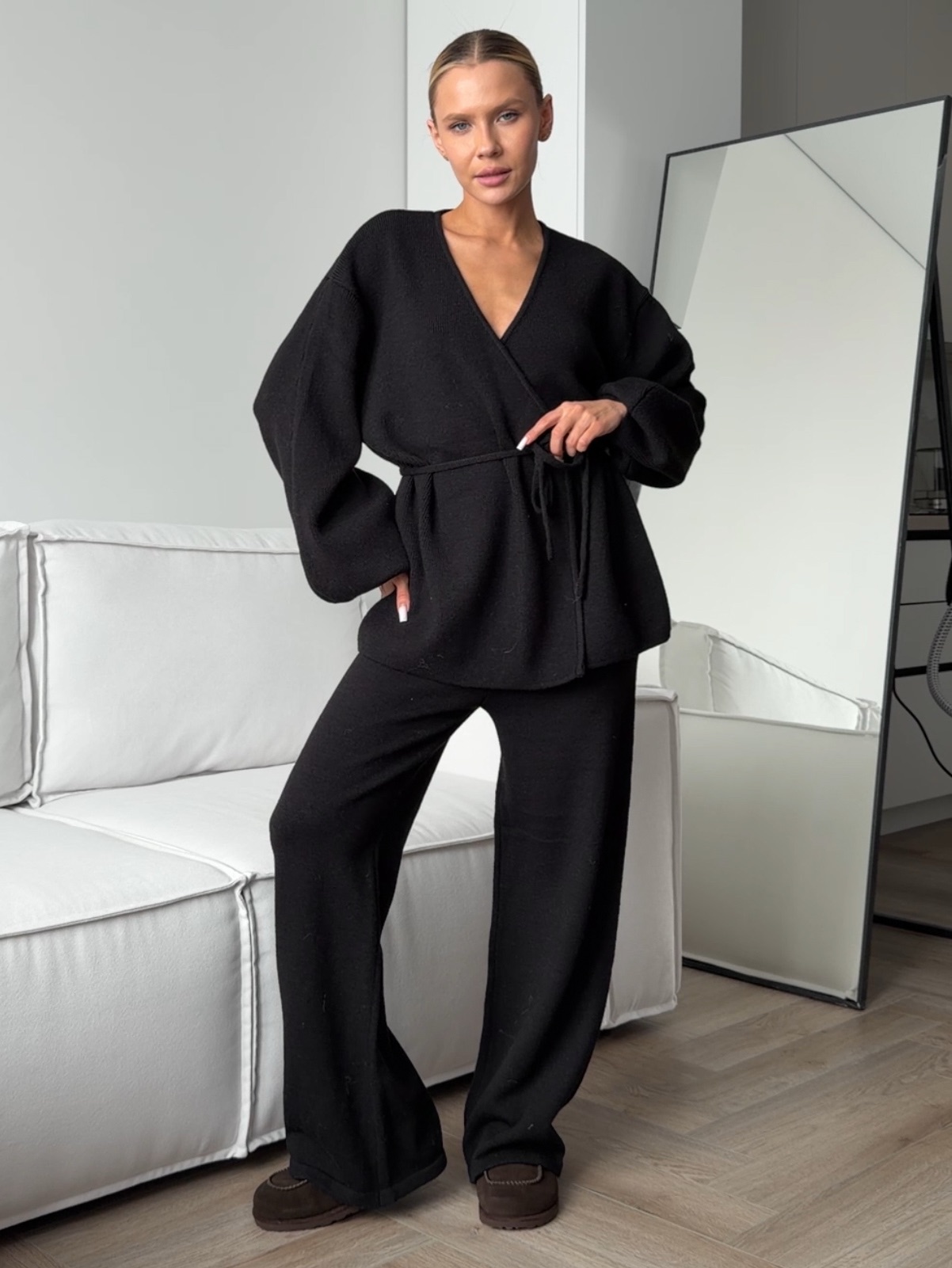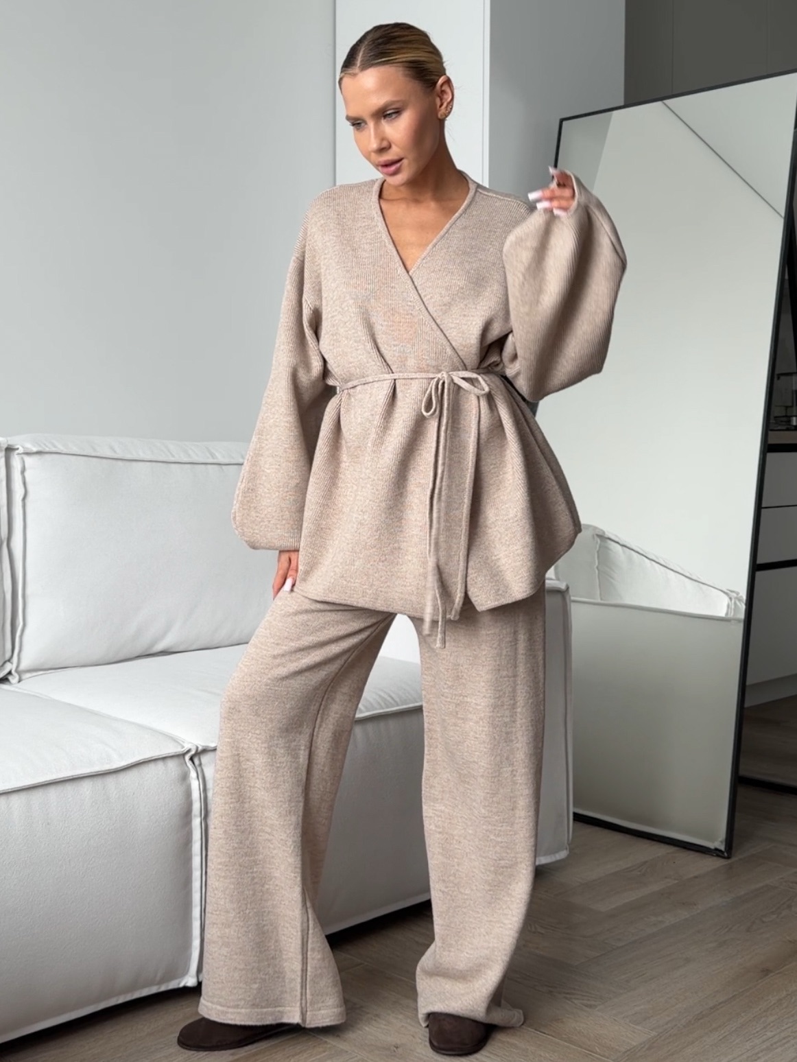 Комплект вязаный, кардиган на завязке и брюки прямого кроя