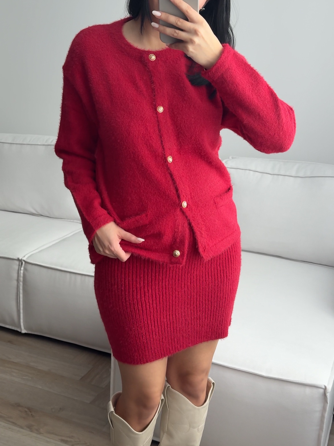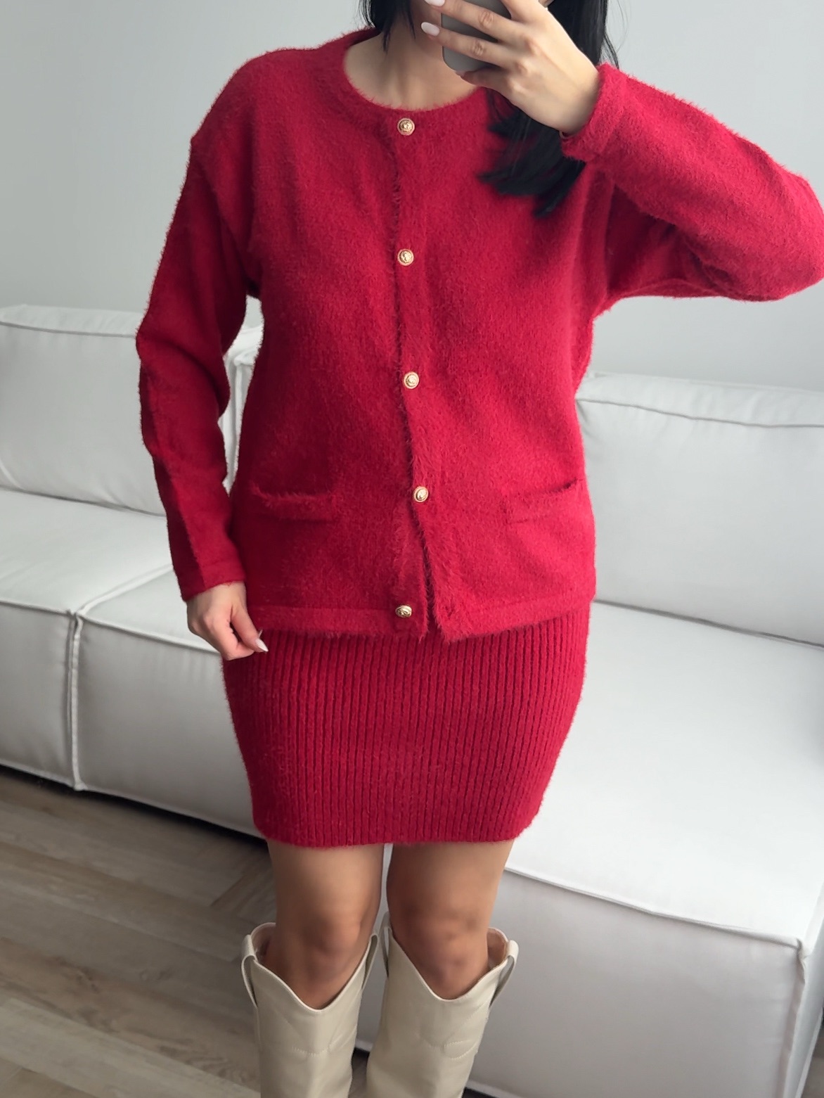 Комплект вязаный, пушистый, юбка и кардиган на пуговицах