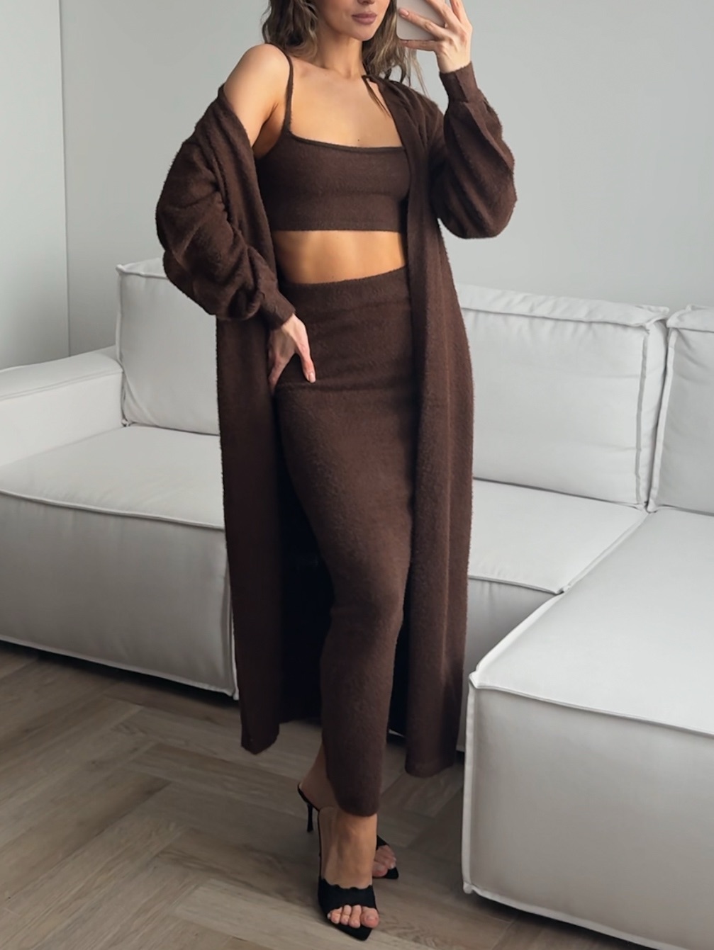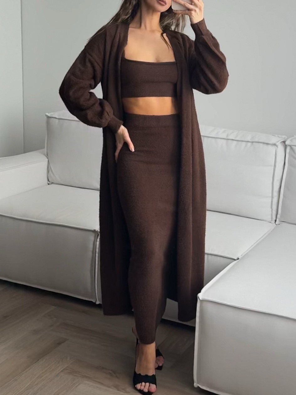 Комплект вязаный, пушистый, юбка, топ, кардиган