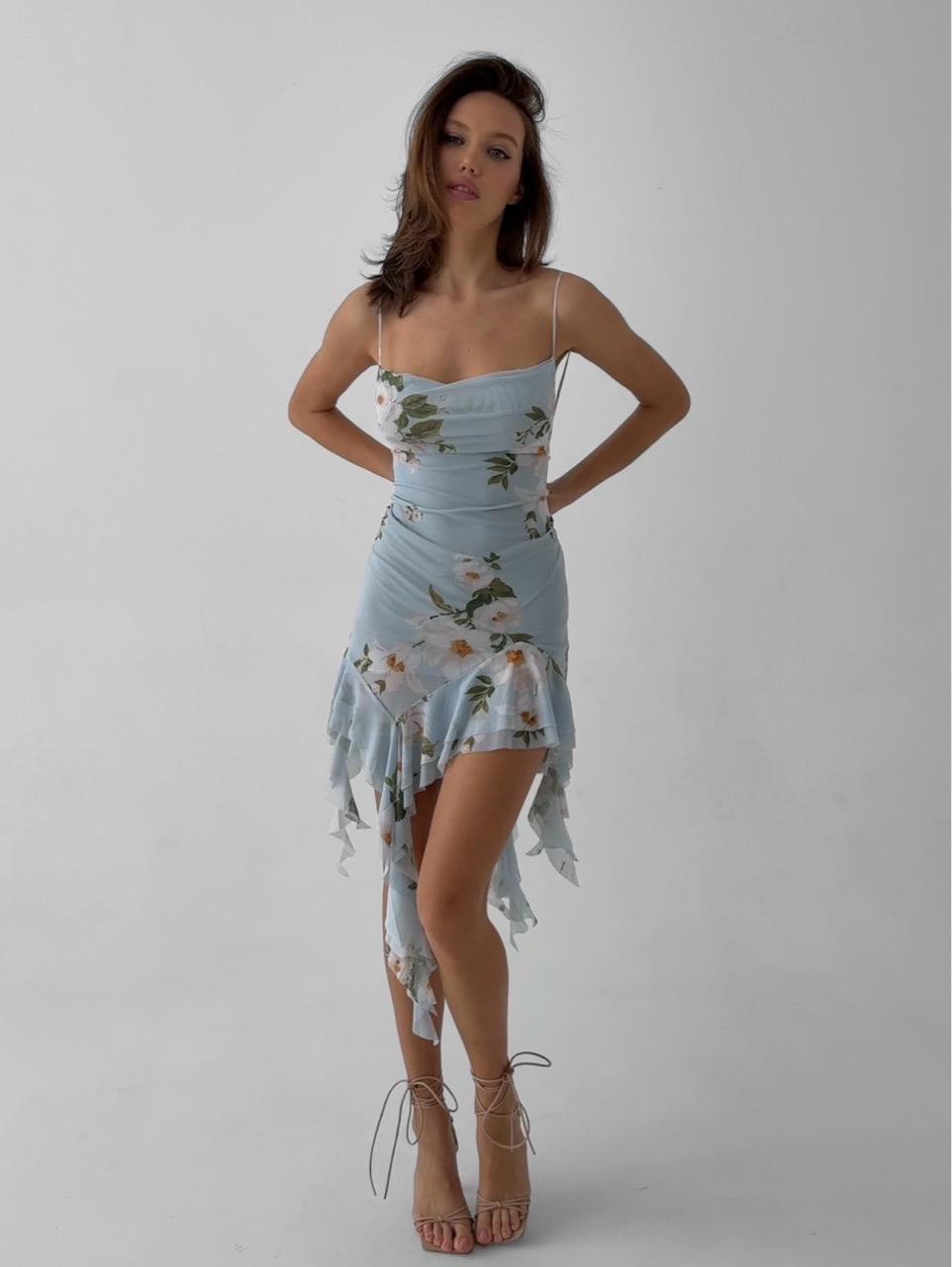 Платье короткое, на тонких бретелях, с воланами, с цветочным принтом