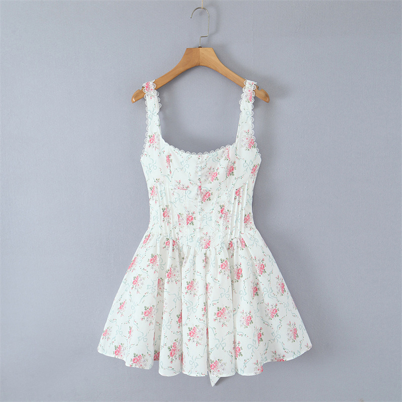 Платье короткое, с цветочным принтом и ажурной окантовкой