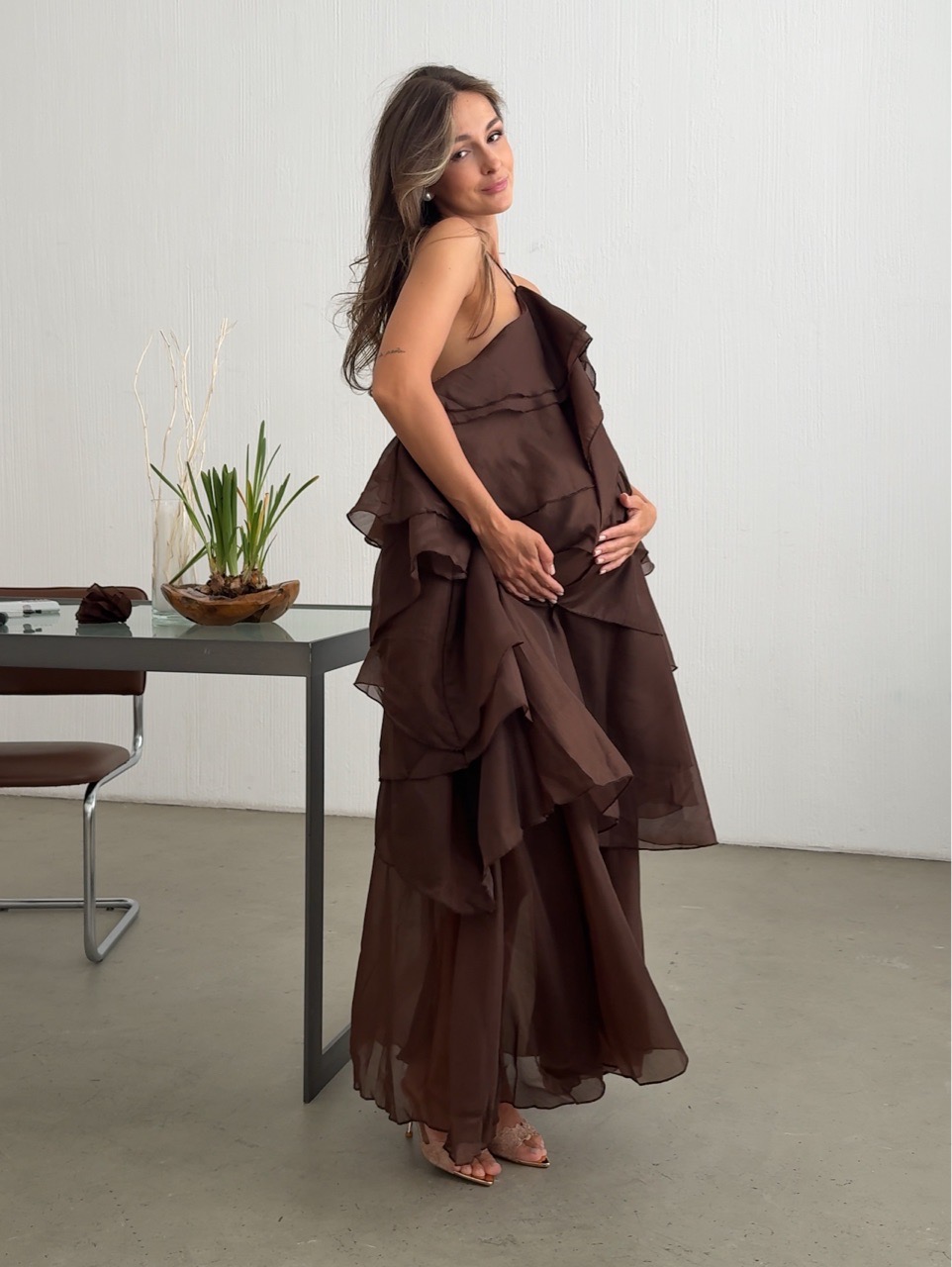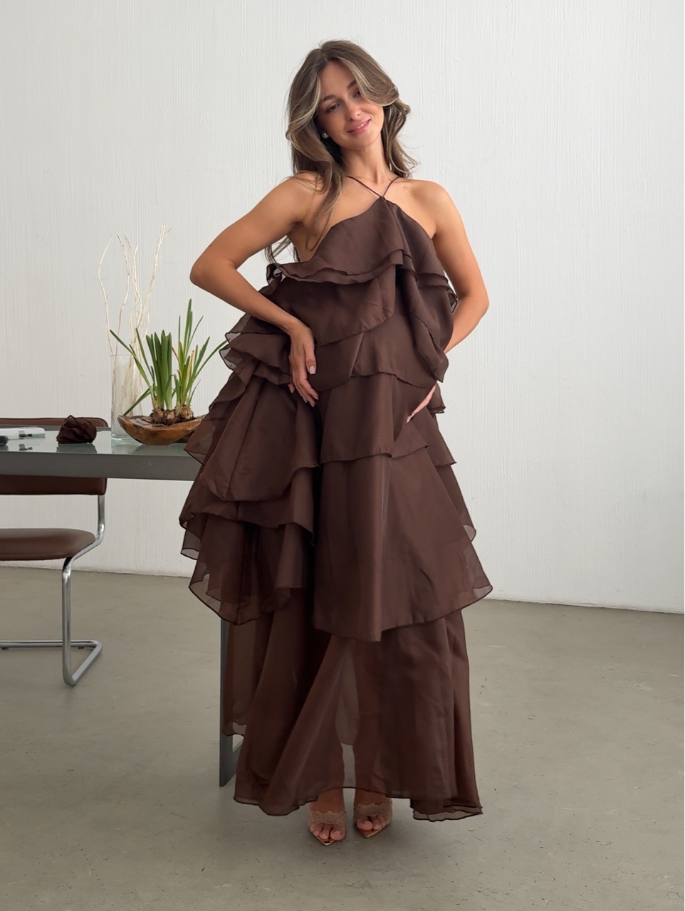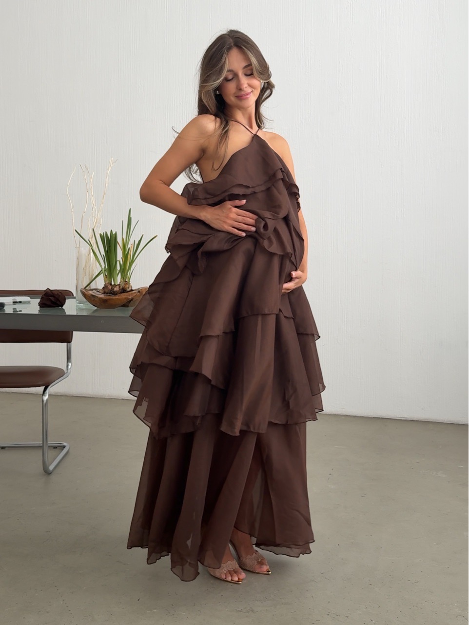 Платье шифоновое, длинное, с воланами