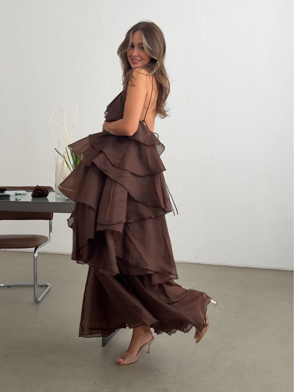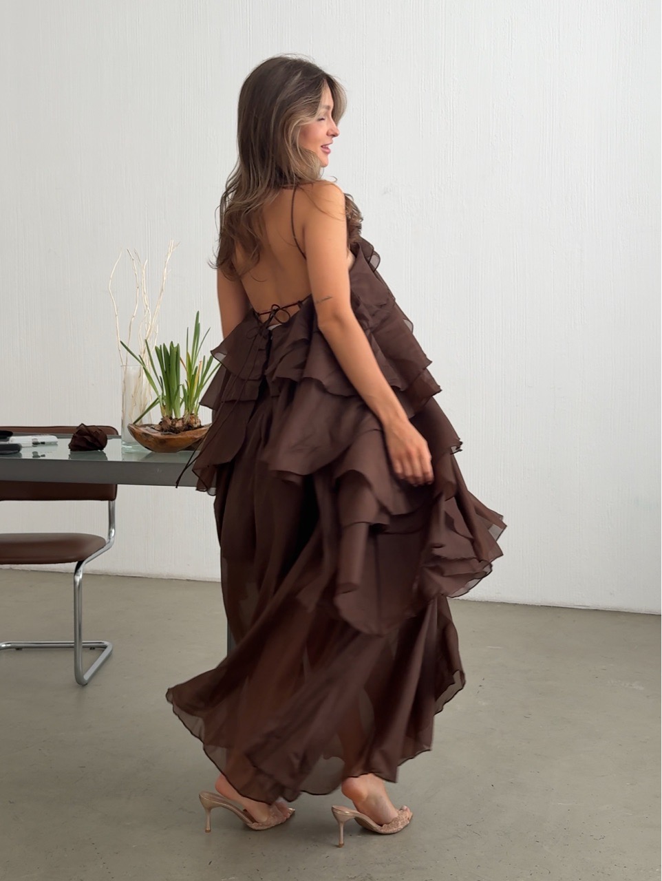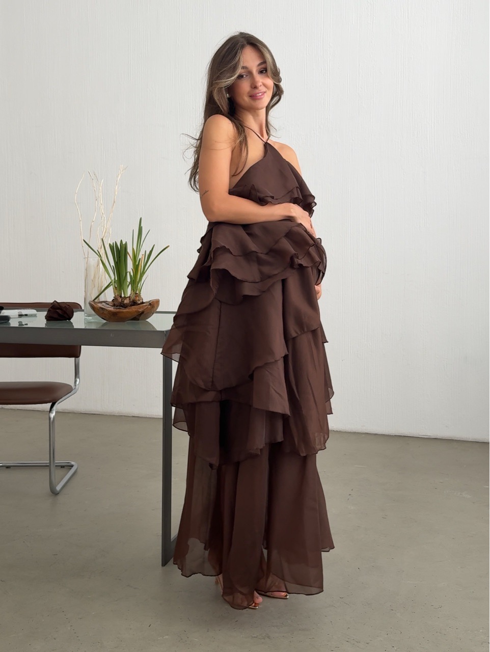 Платье шифоновое, длинное, с воланами