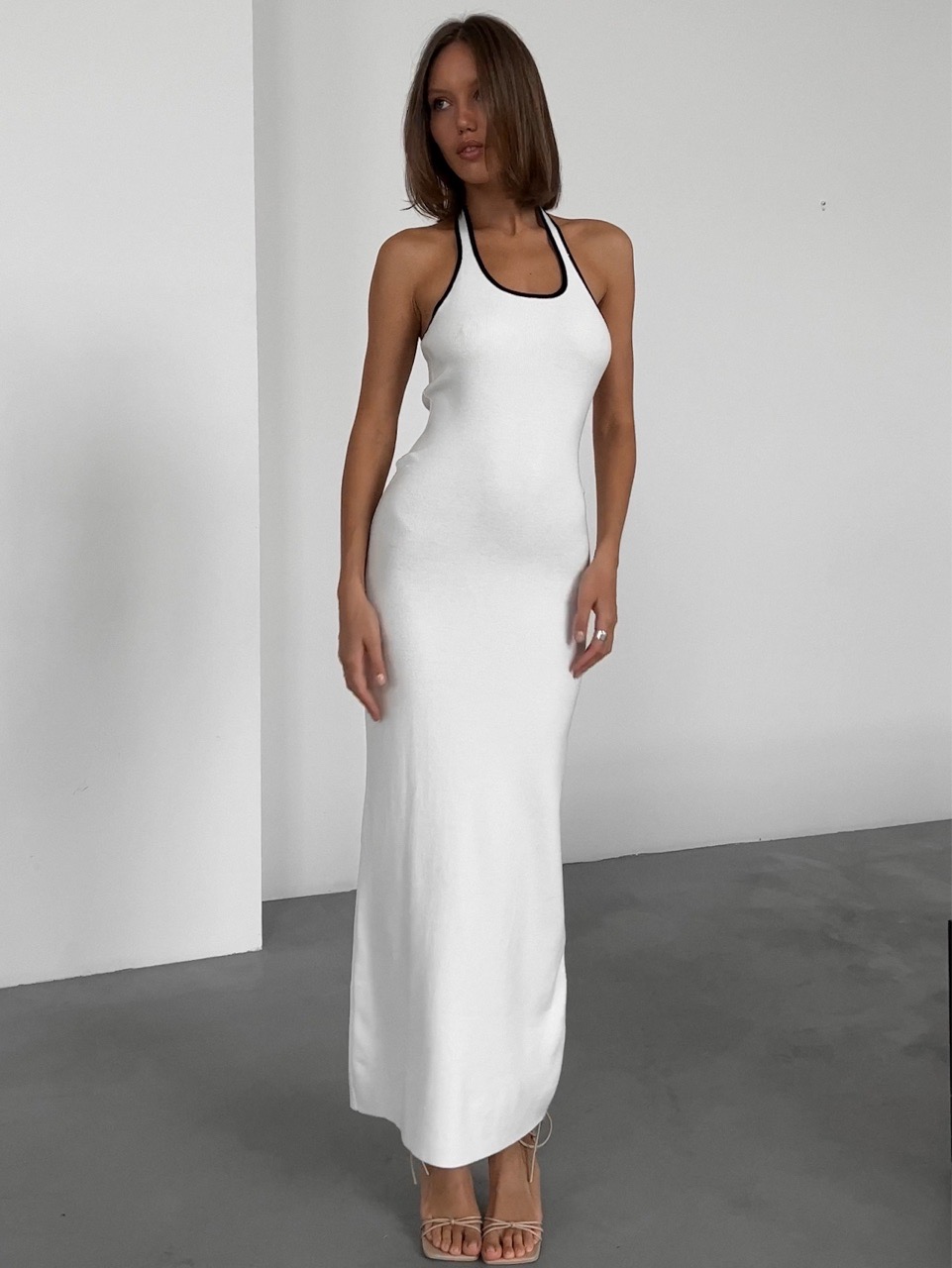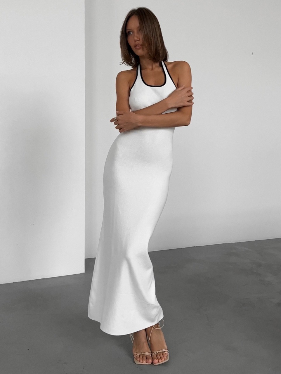Платье вязаное, длинное, на лямке через шею, c разрезом