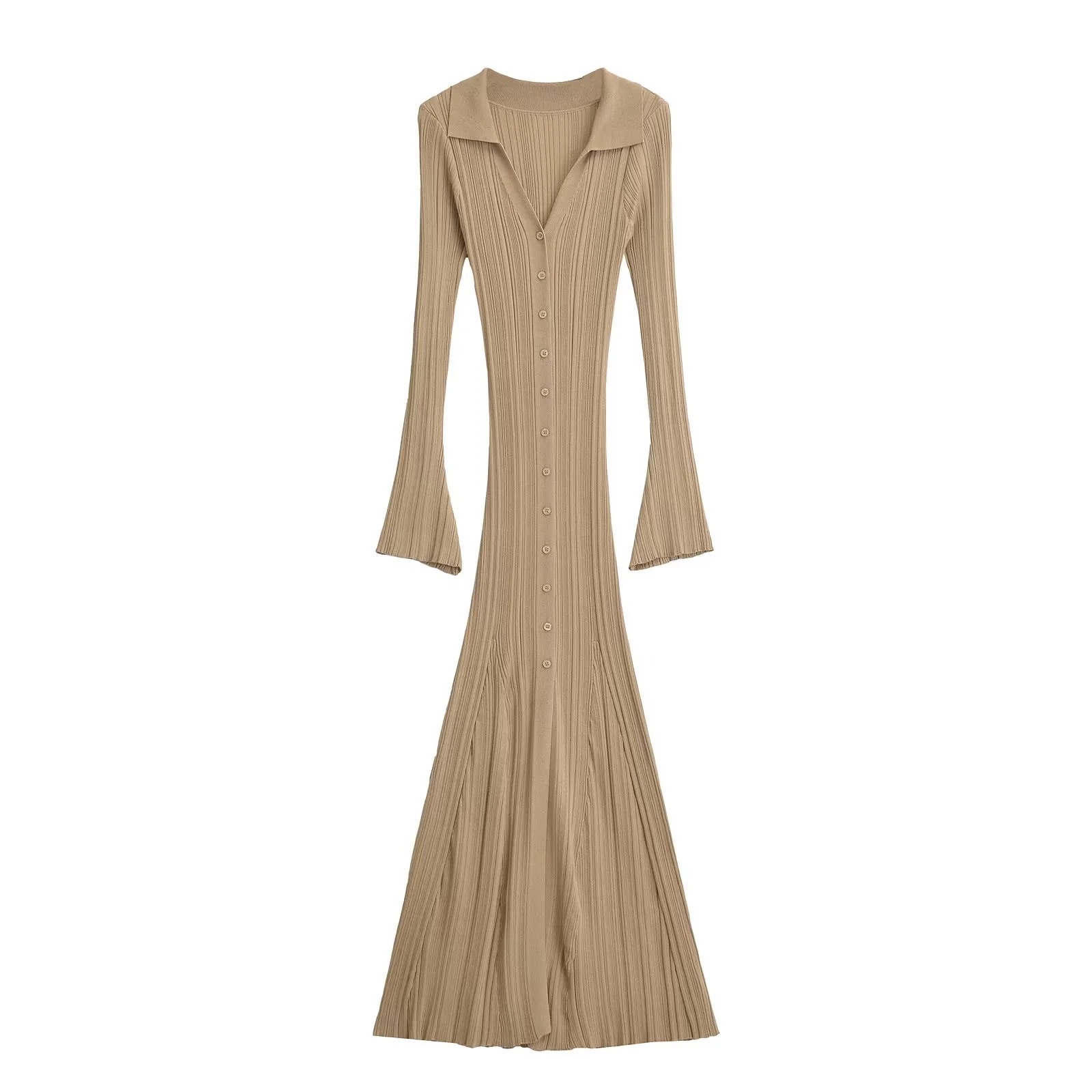 Платье вязаное, длинное, расклешенное, на пуговицах, с воротником