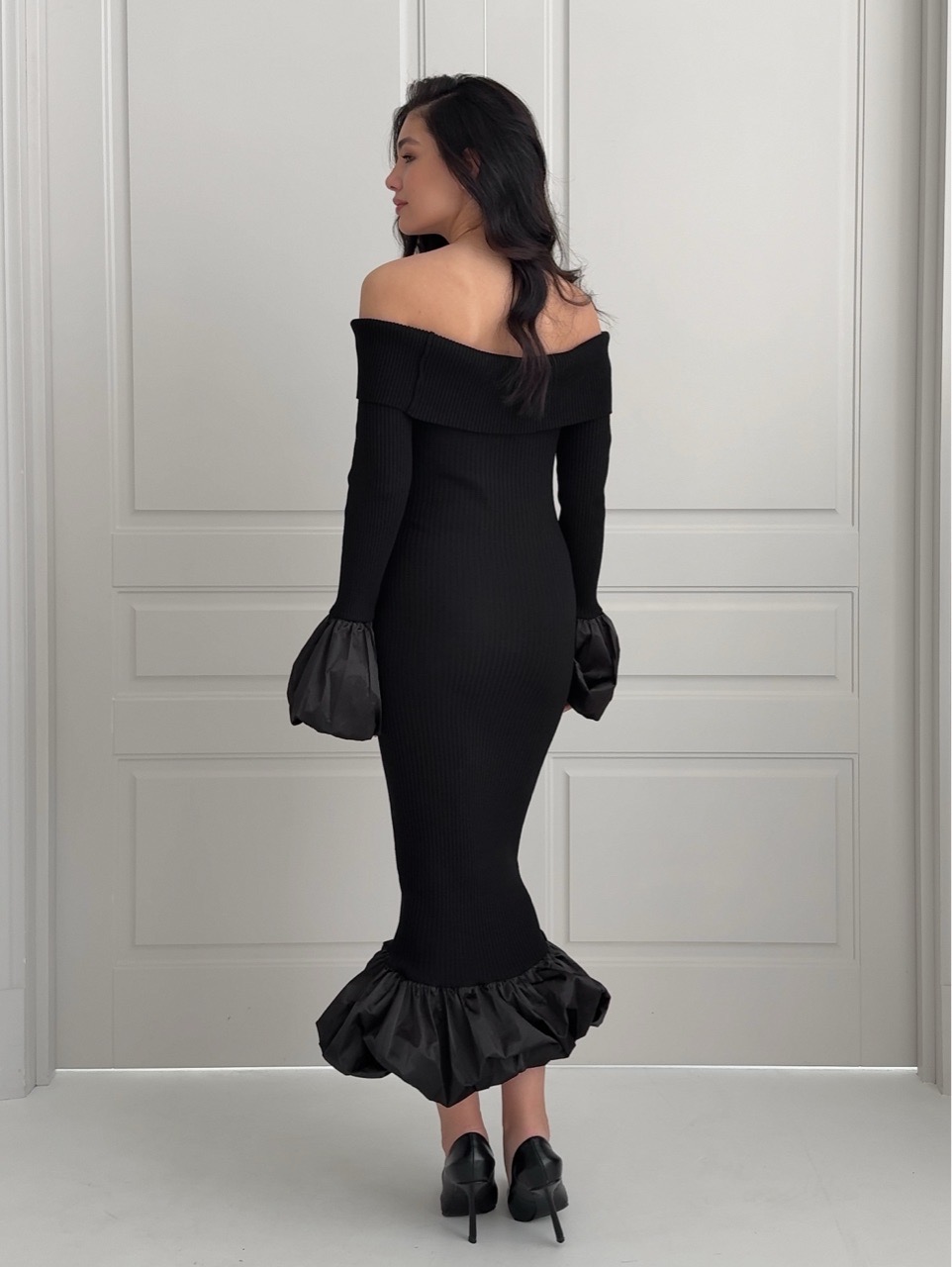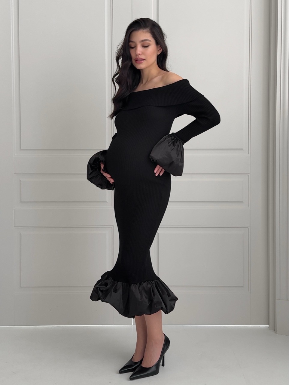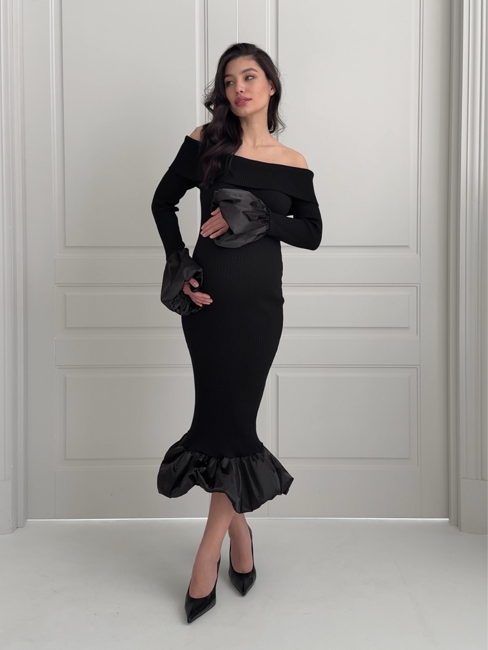 Платье вязаное, длинное, с открытыми плечами, с акцентными рукавами и подолом